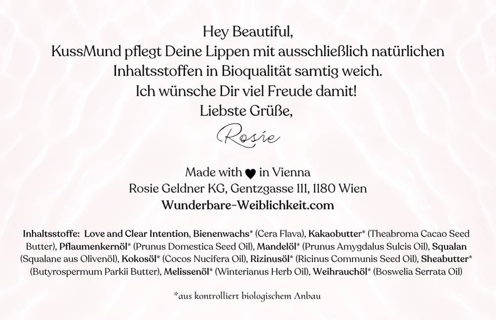 | Inhaltsstoffe | Love & clear Intention, Bienewachs*, Kakaobutter*, Pflaumenkernöl*, Mandelöl*, Squalan, Kokosöl*, Sheabutter*, Vitamin E, Melissenöl*, Weihrauchöl* |